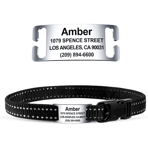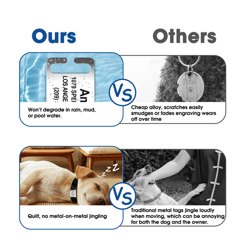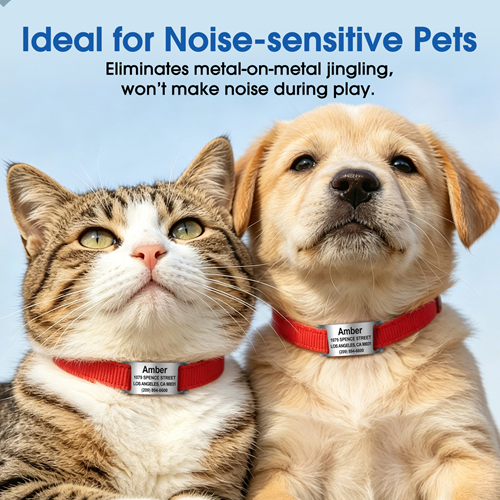 • Collar Not Included, no more jingle-jangle: open ended curved rectangular arch design sits perfectly against the collar without sticking out awkwardly. The easy slide-on design makes the pet ID tag silent, eliminates metal-on-metal jingling like traditional tags during play, ideal for noise-sensitive pets.