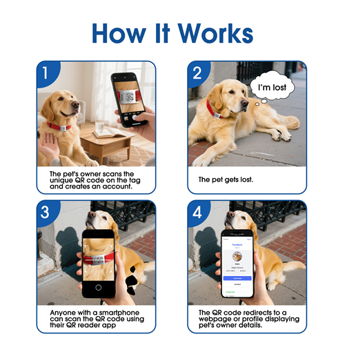 • Real-time alerts - Getting alerts when someone scans Pet Tag's custom QR code, so you know they've been found. Scanning the custom QR code gives the finder instant access to a personalized pet profile—complete with photos, phone numbers, addresses, and other details you've provided. This allows them to contact you immediately by call or text.