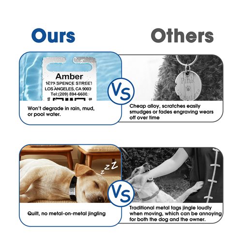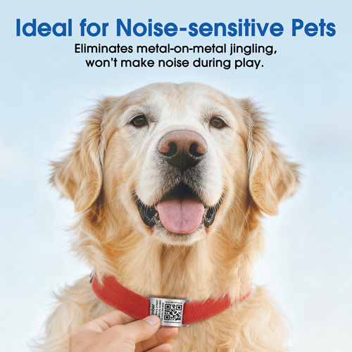 • No more jingle-jangle: open ended curved rectangular arch design sits perfectly against the collar without sticking out awkwardly. The easy slide-on design makes the pet ID tag silent, eliminates metal-on-metal jingling like traditional tags during play, ideal for noise-sensitive pets.