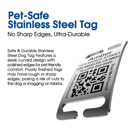 • Deep Crisp Laser Engraved & upgradable QR Code: the stainless steel plate is sleek, durable, solid construction which feels indestructible, and the engraved text is sharp and easy to read, the polished edges are smooth with no sharp spots that could irritate skin. And more the owner can update the information without having to get new tags.